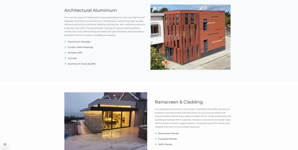 The company works across a broad mix of areas, from laser cutting and metal folding to powder coating, architectural aluminium, rainwater goods, data centre fabrication, and mild steel products. With so much to cover, it was important that the site felt clear, easy to move through, and simple for visitors to follow from the first click.
